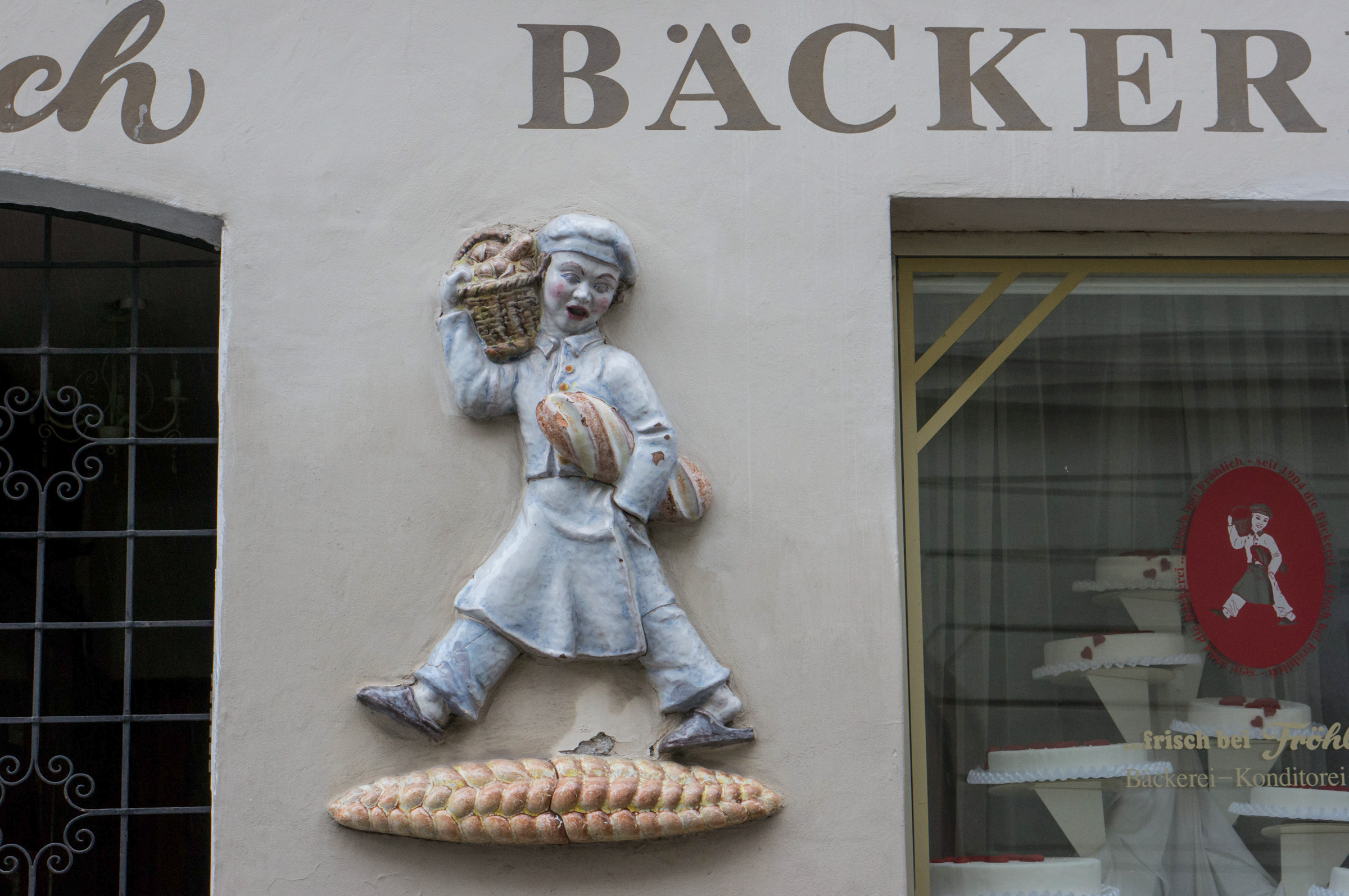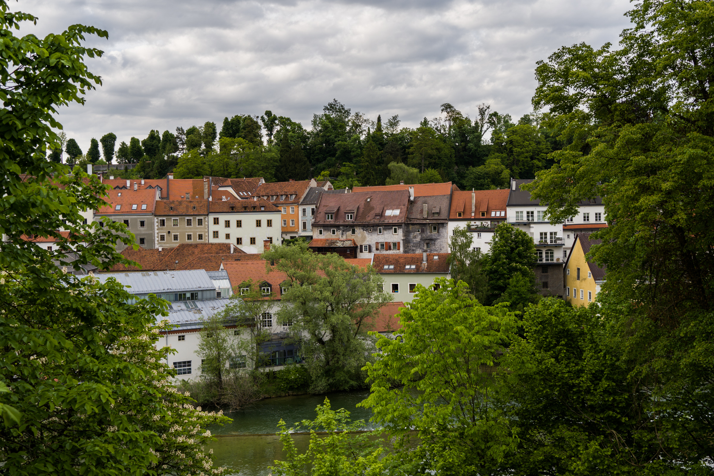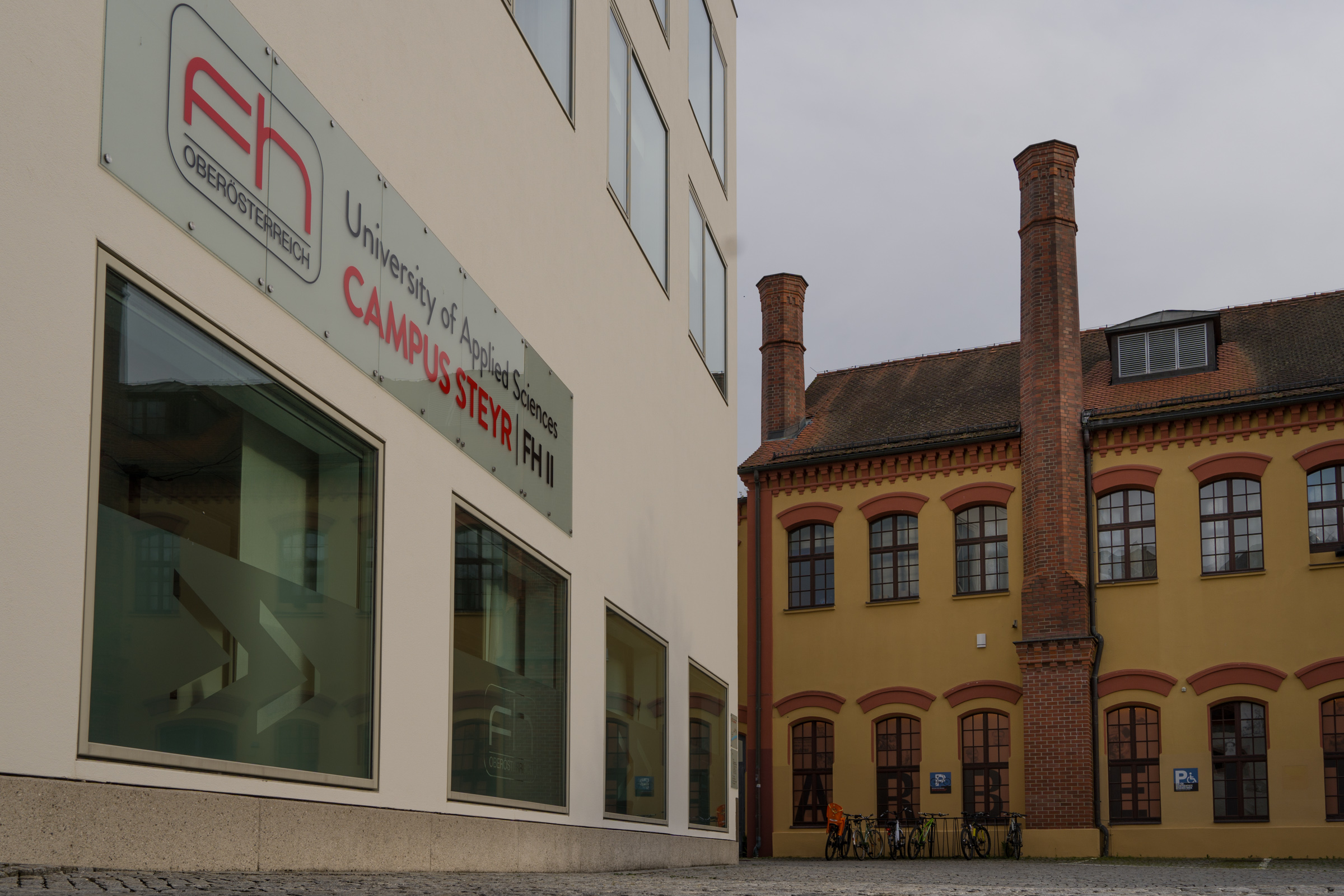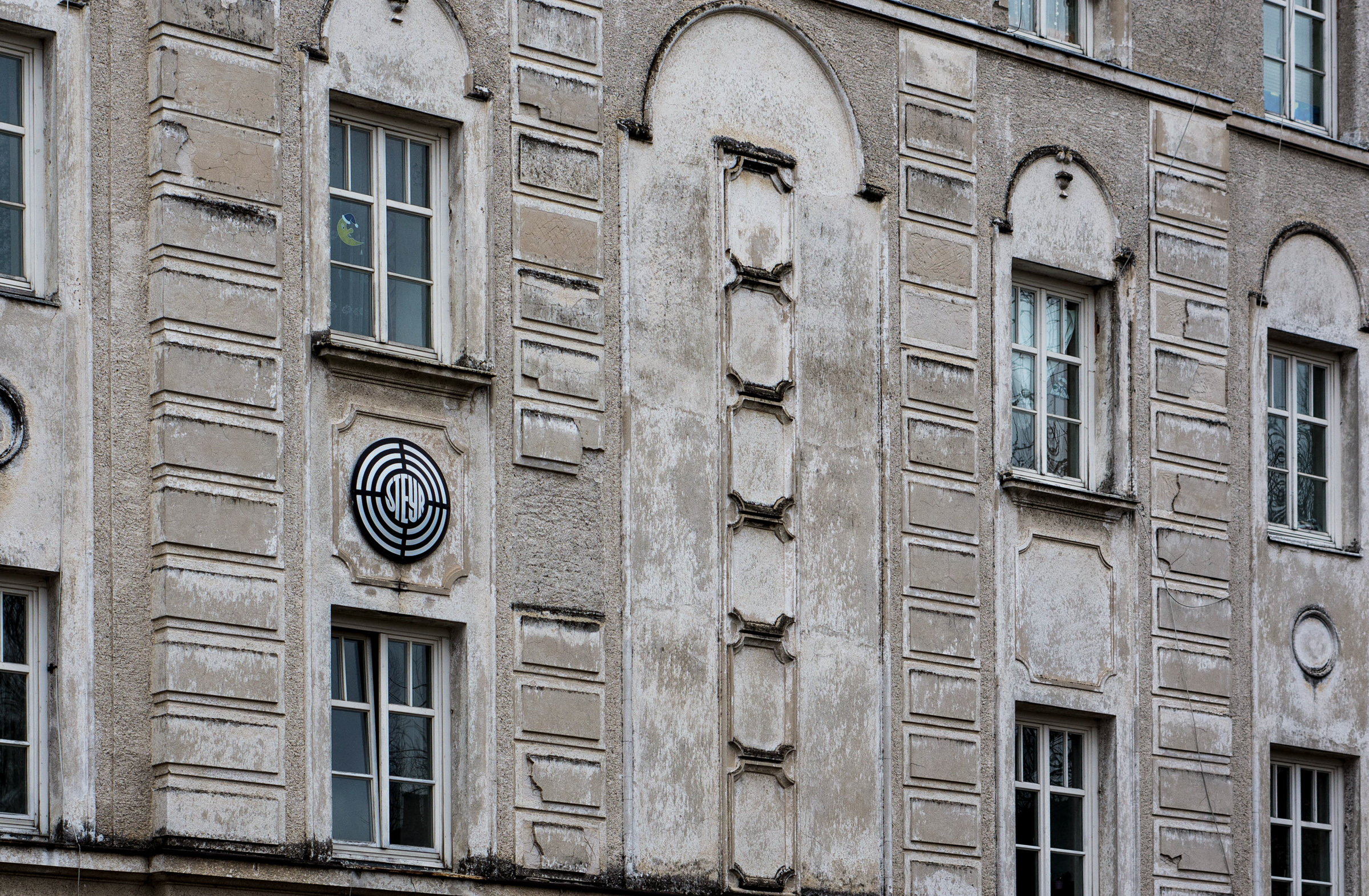 das Logo der Steyr-Werke auf Arbeiterhäusern